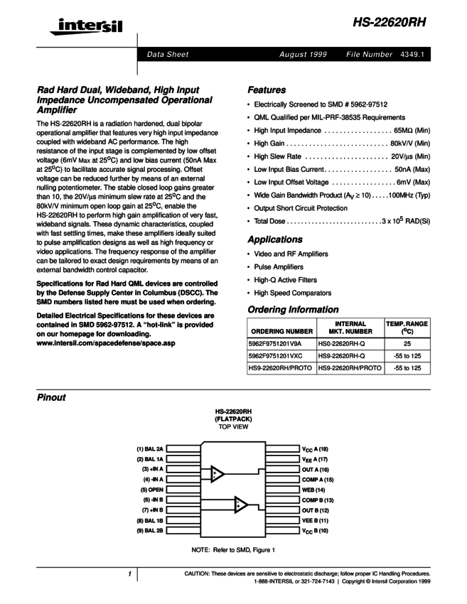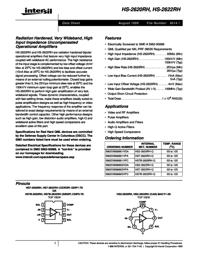 Rad-Hard, Very Wideband, High Input Impedance Uncompensated Operational Amplifiers
