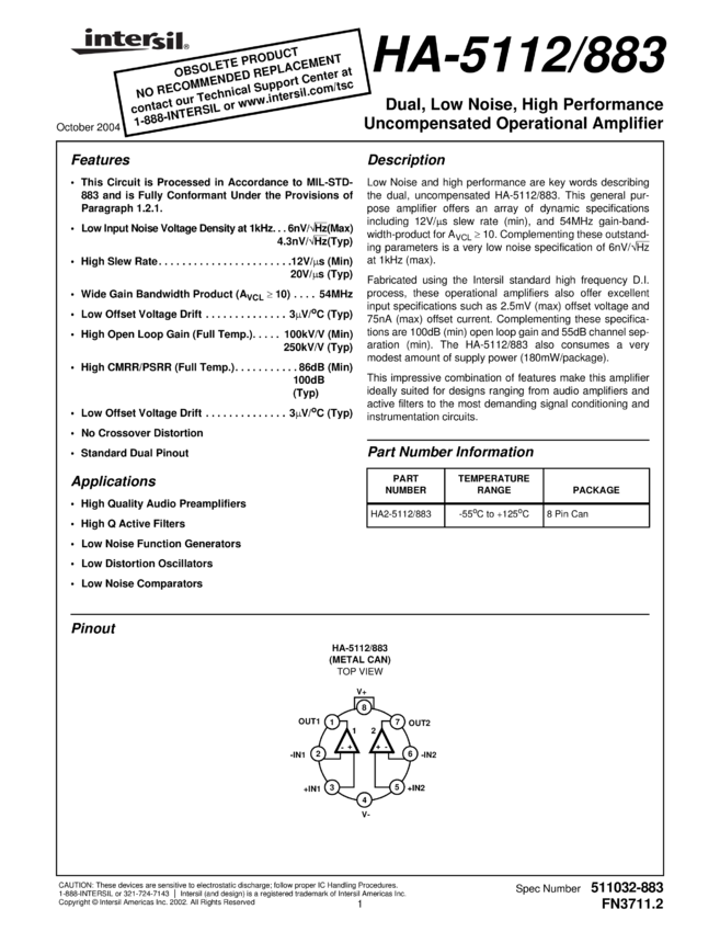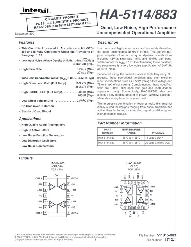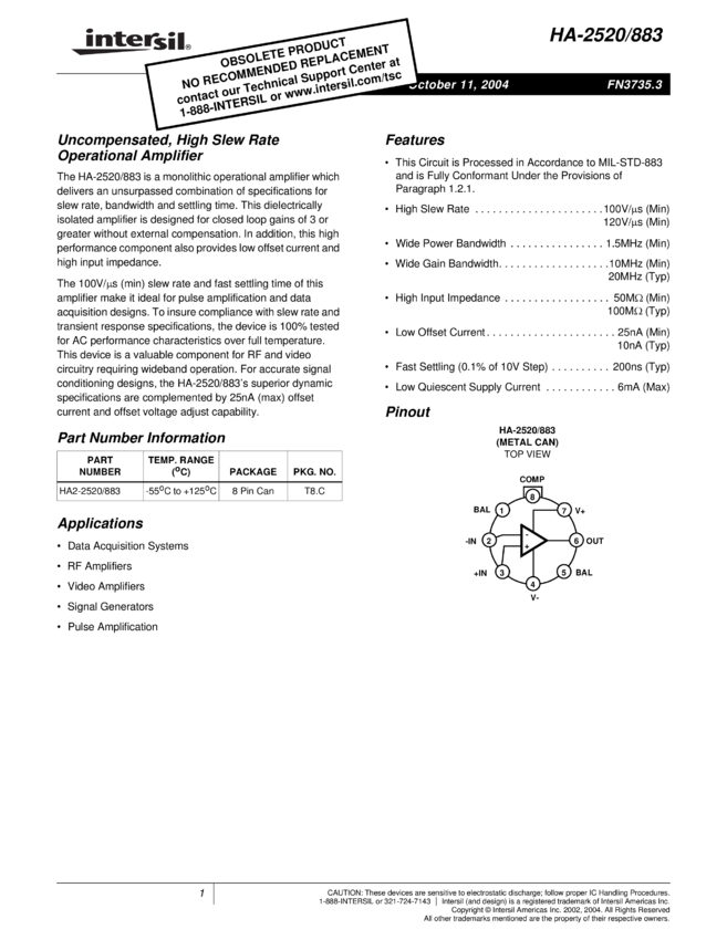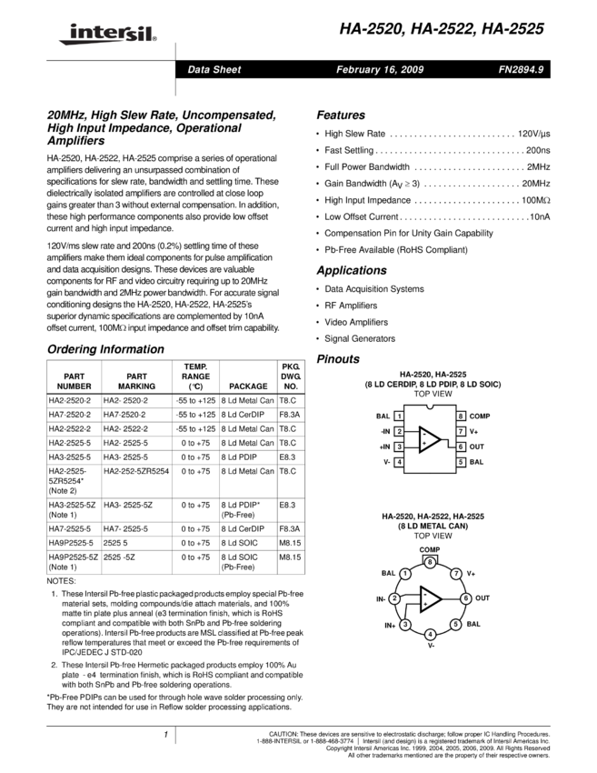 20MHz, High Slew Rate, Uncompensated, High Input Impedance, Operational Amplifiers
