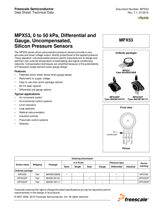 MPX53, 0 to 50 kPa, Differential and Gauge, Uncompensated Silicon Pressure Sensors