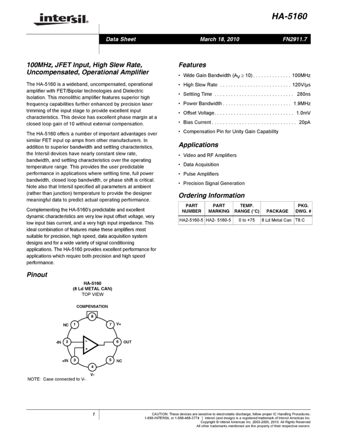 100MHz, JFET Input, High Slew Rate, Uncompensated, Operational Amplifiers