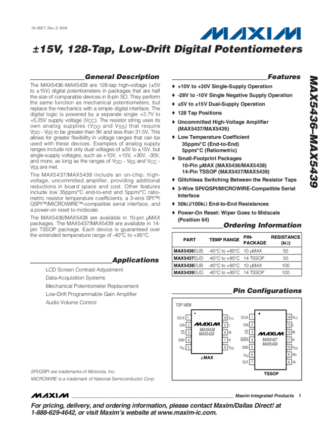 MAX5439 High Voltage &#17715V, 128-Tap, Low-Drift Digital Potentiometers w/Uncommitted Op-Amp