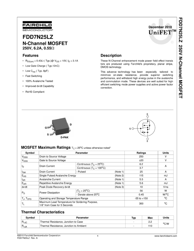N-Channel UniFET<sup>TM</sup> MOSFET 250V, 6.2A, 550mΩ