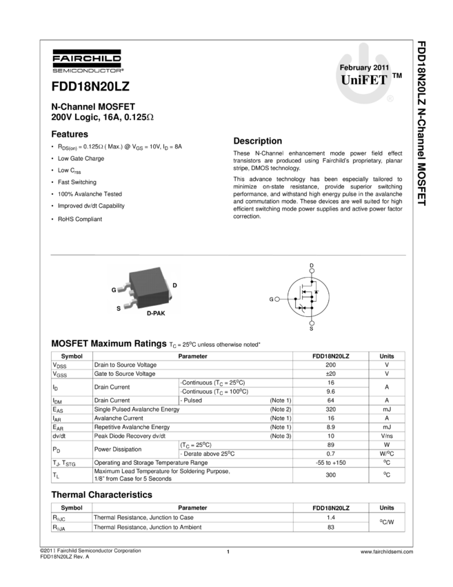 N-Channel UniFET<sup>TM</sup> MOSFET 200V, 16A, 125mΩ