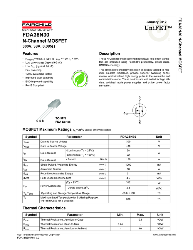 N-Channel UniFET<sup>TM</sup> MOSFET 300V, 38A, 85mΩ