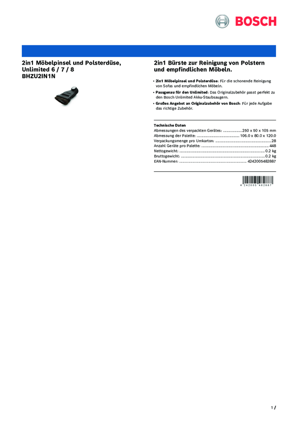 Bosch 2in1 Möbelpinsel und Polsterdüse für Bosch Unlimited 678 BHZU2IN1N