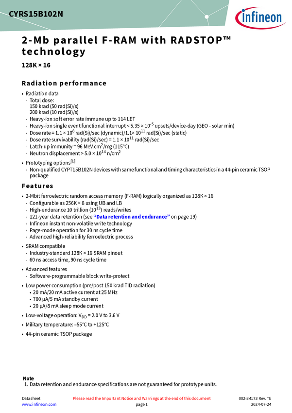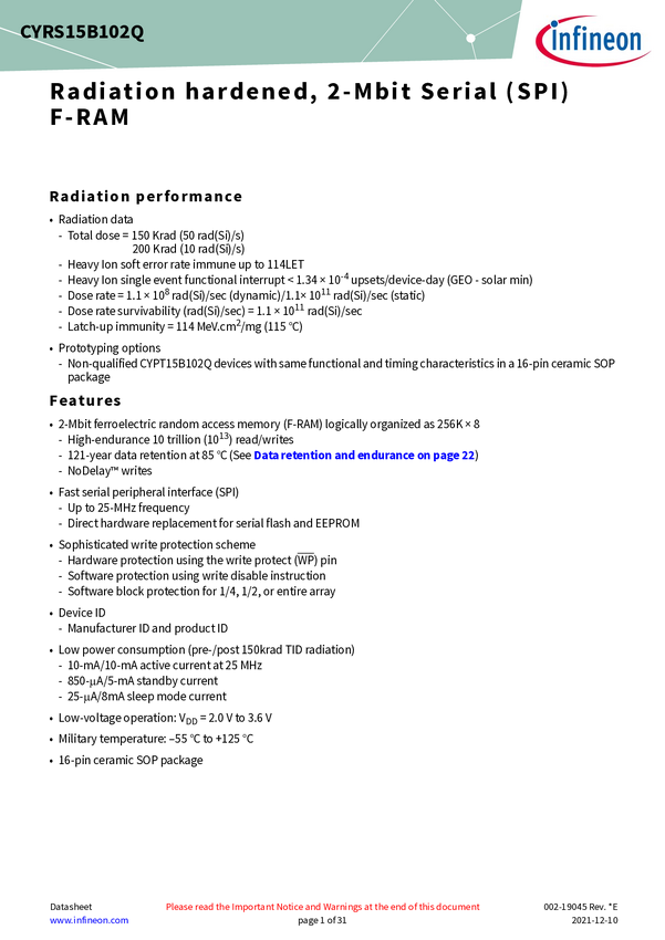 Infineon offers the industry’s first radiation hardened, highly reliable, small footprint, 2 Mb non-volatile SPI Ferroelectric RAM (F-RAM) . Our rad hard SPI F-RAM is one of the industry’s lowest power, non-volatile memory solutions that is Single Event Upset (SEU) immune and virtually unlimited endurance. Infineon’s instant non-volatile write technology and greater than 100-year data retention provides the highest reliability for space applications.NOTE: This part is superseded by 5962R1821601VXC
