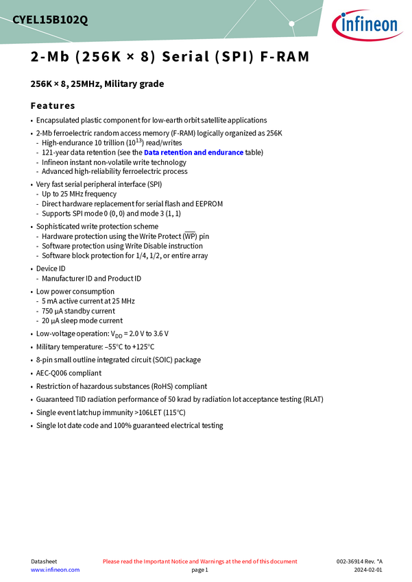 Radiation tolerant, highly reliable, small footprint, 2Mb non-volatile Serial Peripheral Interface (SPI) F-RAM for New Space Our radiation tolerant, 2Mb, SPI Ferroelectric RAM (F-RAM) is one of the industry’s lowest power, non-volatile memory solutions that is guaranteed to 50 Krad (Si) TID and virtually unlimited endurance. Infineon’s instant non-volatile write technology and greater than 100-year data retention provides the highest reliability for new space applications.