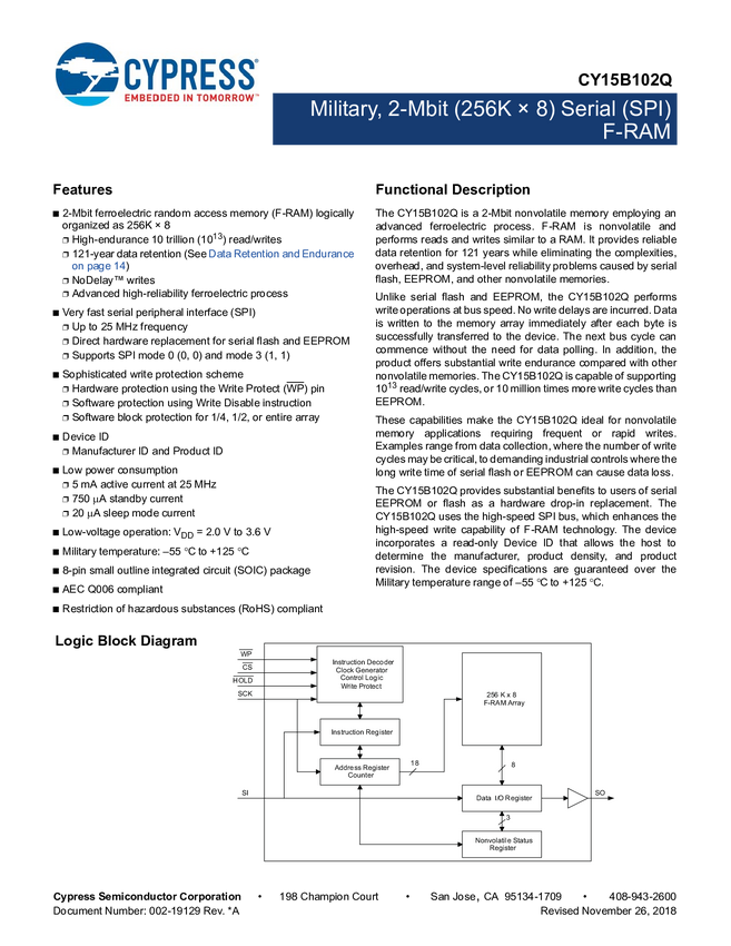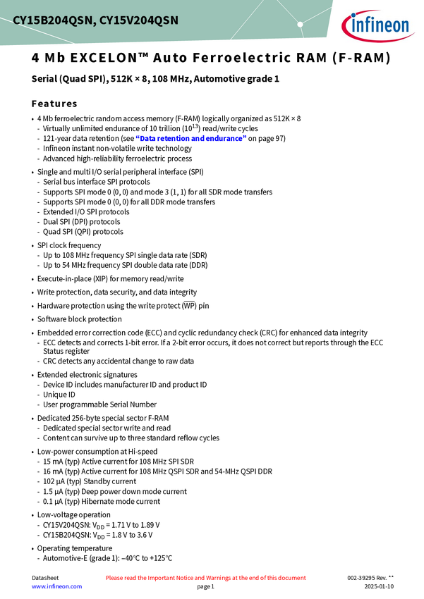 4Mb 3.0V Automotive-E 108MHz QSPI EXCELON™ F-RAM in 8-pin SOIC EXCELON™ Auto F-RAM CY15B204QSN-108SXE is a high-performance, AEC-Q100 qualified 4-Mbit non-volatile memory, designed for high-reliability automotive applications with temperature support up to +125 °C. Equipped with high-speed, low-pin-count QSPI interface, it offers read/write bandwidth up to 432-Mbits/s. Unlike serial flash, it performs write operations at bus speed, ensuring no write delays and offering virtually unlimited write endurance.