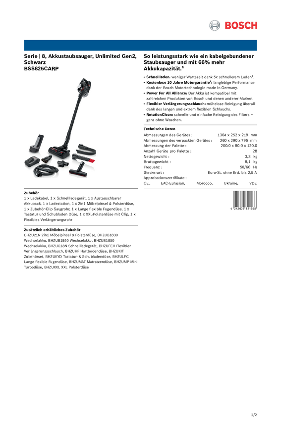 Bosch Haushalt Unlimited Gen2 BSS825CARP Odkurzacz ręczny, akumulatorowy 18 V