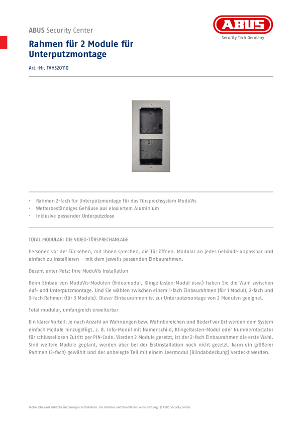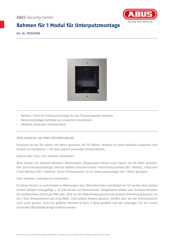 ABUS TVHS20100 ABUS TVHS20100 Rahmen für 1 Modul für Unterputz Rama 1fach