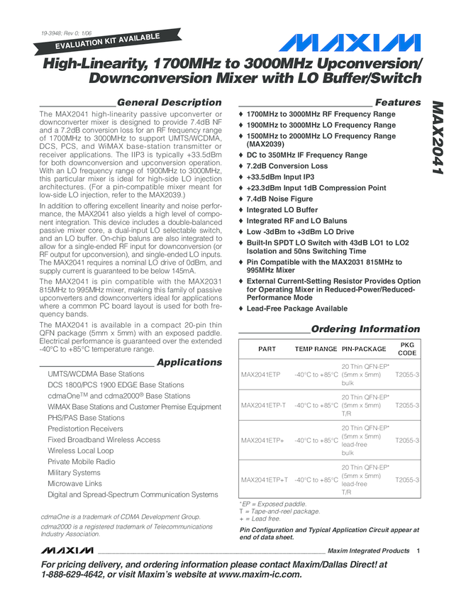 MAX2041 High-Linearity, 1700-3000MHz Upconversion/Downconversion Mixer with LO Buffer/Switch
