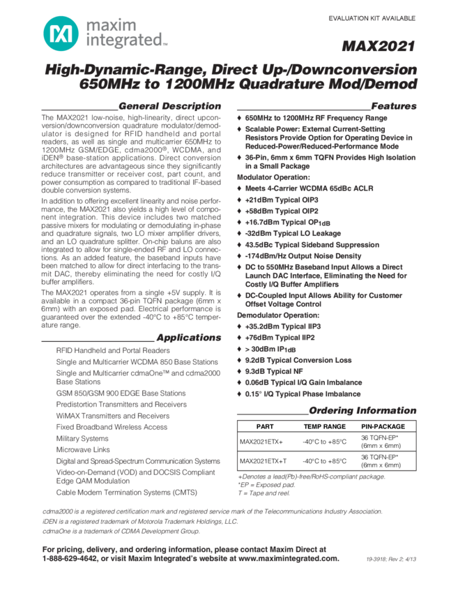MAX2021 High-Dynamic-Range, Direct Upconversion 750MHz to 1200MHz Quadrature Modulator / Demodulator