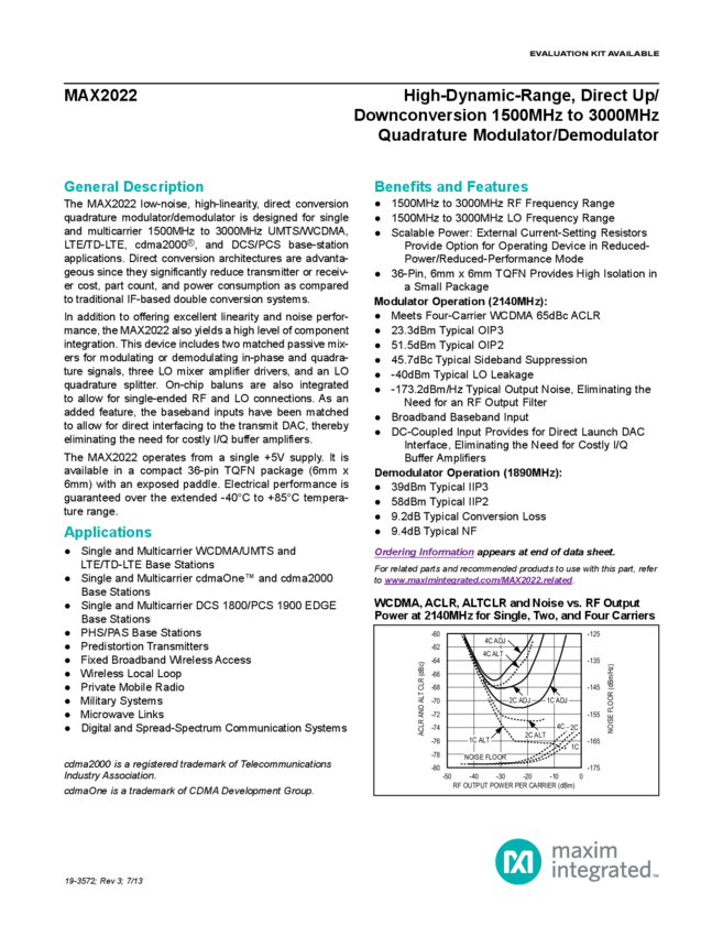 MAX2022 High-Dynamic-Range, Direct Upconversion 1500MHz to 3000MHz Quadrature Modulator / Demodulator