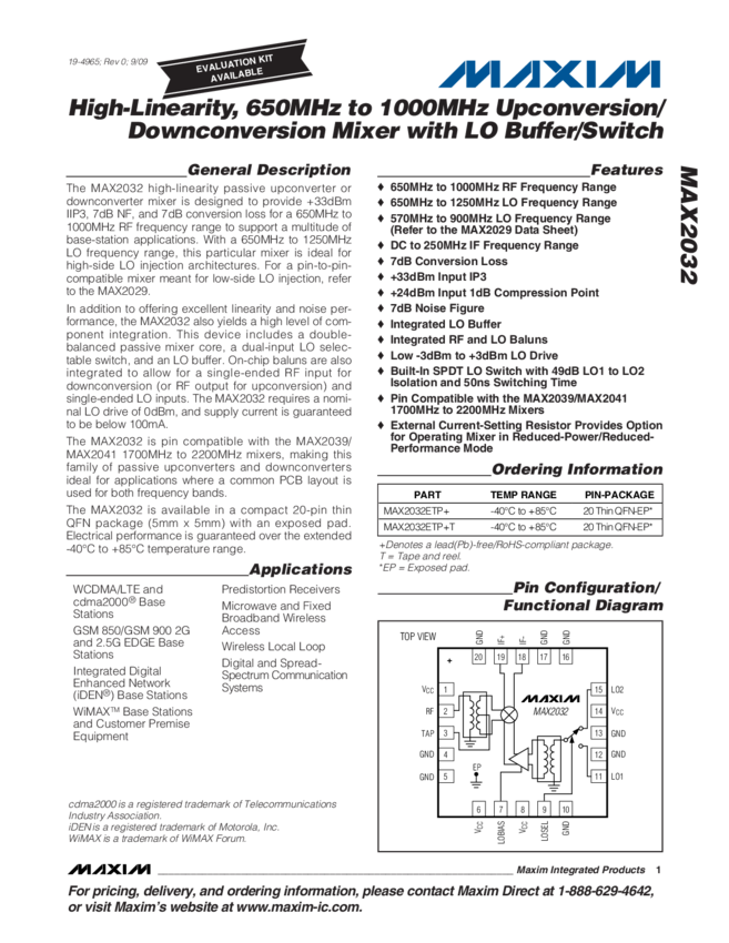 MAX2032 High-Linearity, 650MHz to 1000MHz Upconversion/ Downconversion Mixer with LO Buffer/Switch