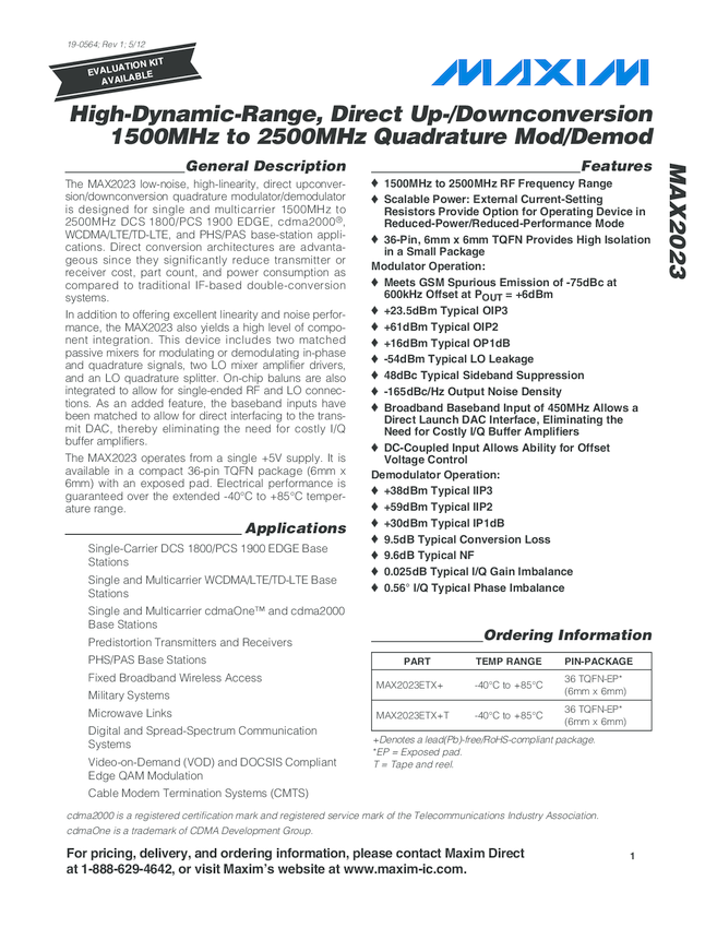 MAX2023 High-Dynamic-Range, Direct Upconversion 1500MHz to 2300MHz Quadrature Modulator / Demodulator