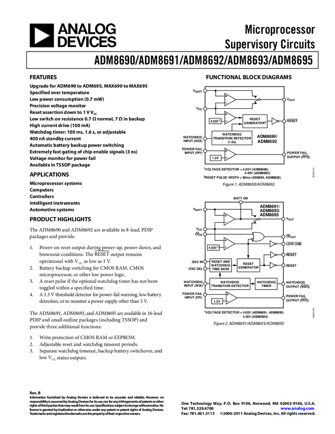ADM8695: µP Supervisor with Backup Battery Switchover, 200ms Nominal Adjustable Reset Period, Adjustable Watchdog Period, Chip Enable Signals, 4.65V Threshold Voltage, Watchdog, Backup Battery and Low Vcc Status O/Ps. Upgrade for ADM695