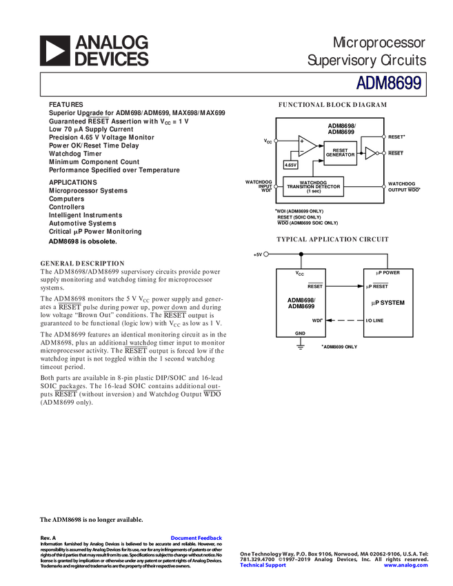 Microprocessor Supervisory Circuit with 4.65V Threshold Voltage, Low Supply Current and Active Low Reset Output. Upgrade for ADM698