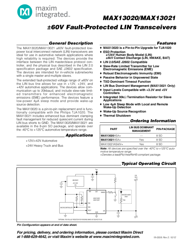 MAX13021 The MAX13020/MAX13021 are upgrades to industry standard LIN tranceivers offering +/-60V Fault protection and +/-12kV ESD HBM Protection on the LIN bus
