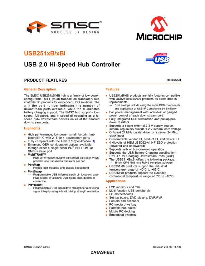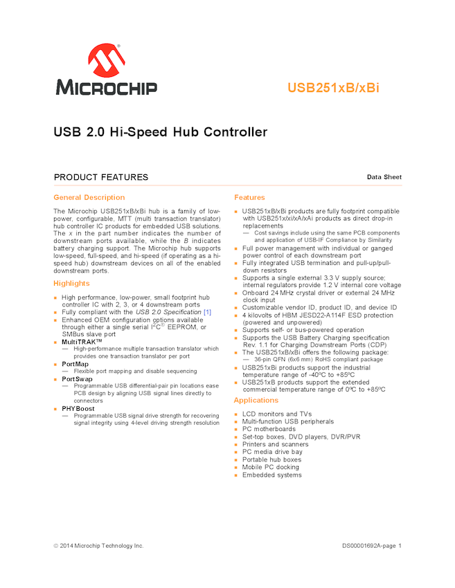 USB251xB/USB251xBi USB 2.0 Hi-Speed Hub Controller Data Sheet (01/17/2014)