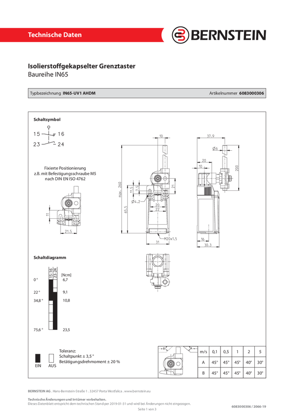 Przełącznik pozycyjny Bernstein IN65-UV1 AHDM 6083000306, 240 V/AC, 5 A, IP66/IP67, 5 szt.