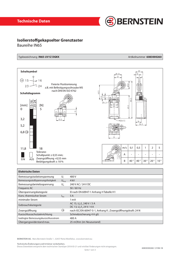 Przełącznik pozycyjny Bernstein IN65-UV1Z DGKK 6083000260, 240 V/AC, 5 A, IP66/IP67, 5 szt.