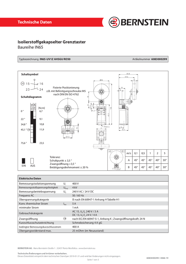 Przełącznik pozycyjny Bernstein IN65-UV1 AVK 6083000285, 240 V/AC, 5 A, IP66/IP67, 5 szt.