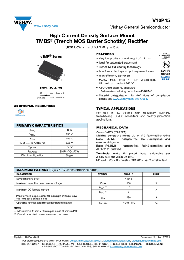 High Current Density Surface Mount TMBS® (Trench MOS Barrier Schottky) Rectifier Ultra Low VF = 0.59 V at IF = 5 A