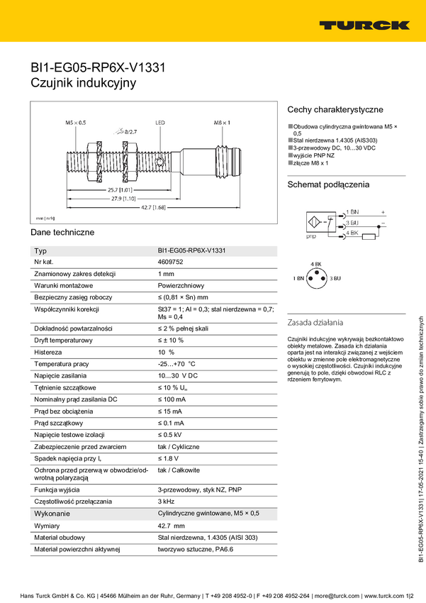 Turck Czujnik indukcyjny podtynkowy PNP, Otwierający BI1-EG05-RP6X-V1331