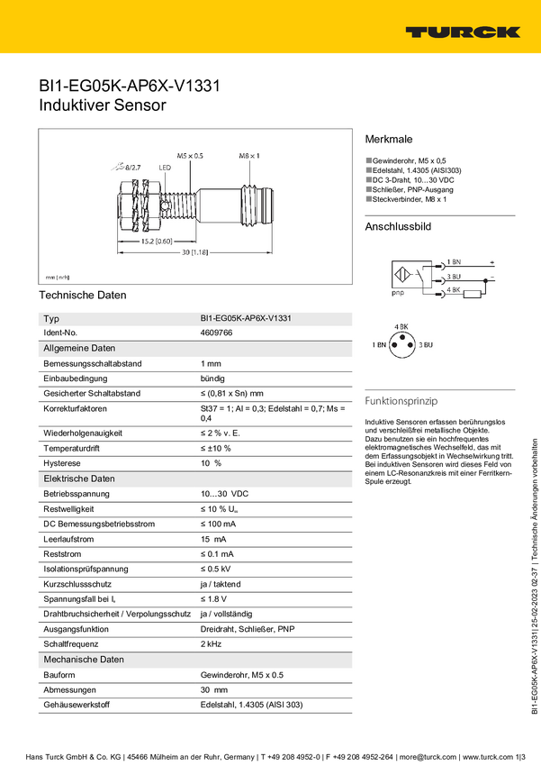 Czujnik indukcyjny Turck BI1-EG05K-AP6X-V1331, 10 - 30 V, 1 szt.