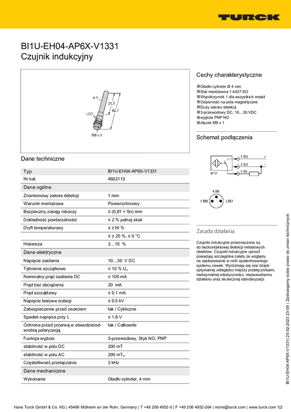 Czujnik indukcyjny Turck BI1-EH04-AP6X-V1331, 10 - 30 V, 1 szt.