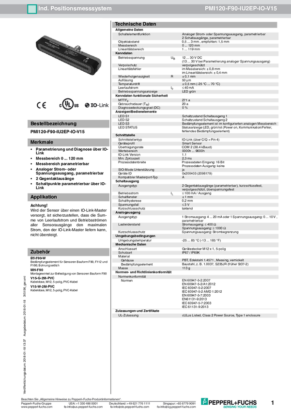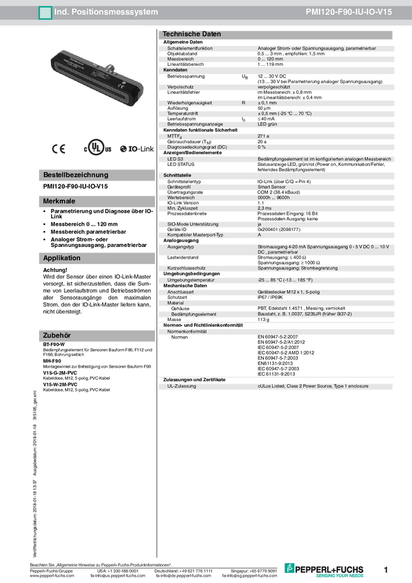 Pepperl+Fuchs Czujnik położenia PMI120-F90-IU-IO-V15 315195 M12, 5 pin