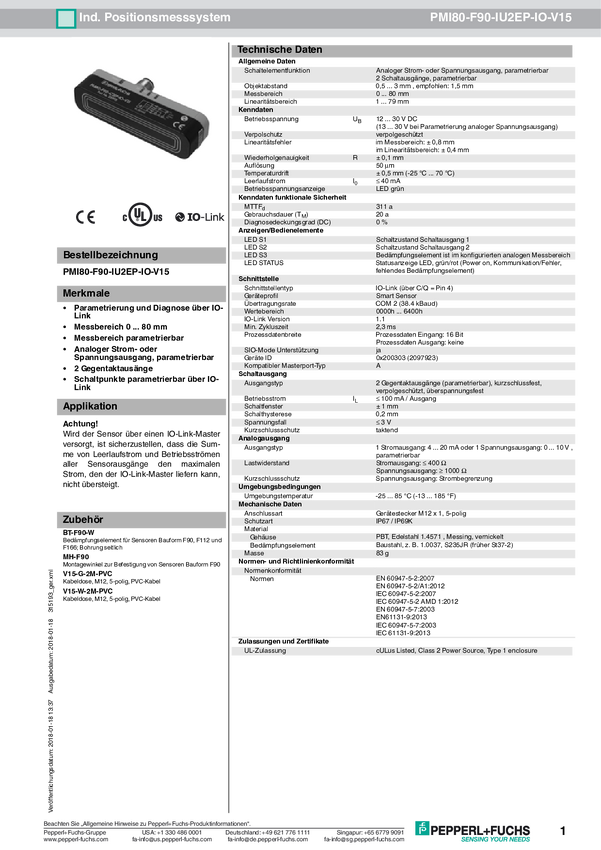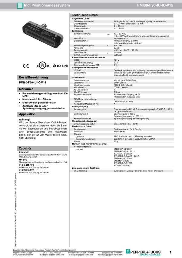 Pepperl+Fuchs Czujnik położenia PMI80-F90-IU-IO-V15 315192 M12, 5 pin