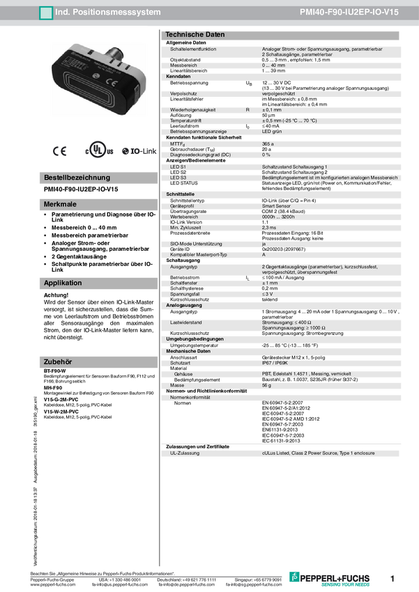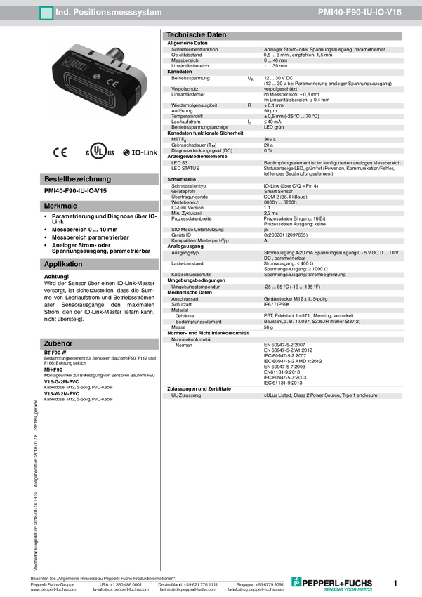 Pepperl+Fuchs Czujnik położenia PMI40-F90-IU-IO-V15 315189 M12, 5 pin