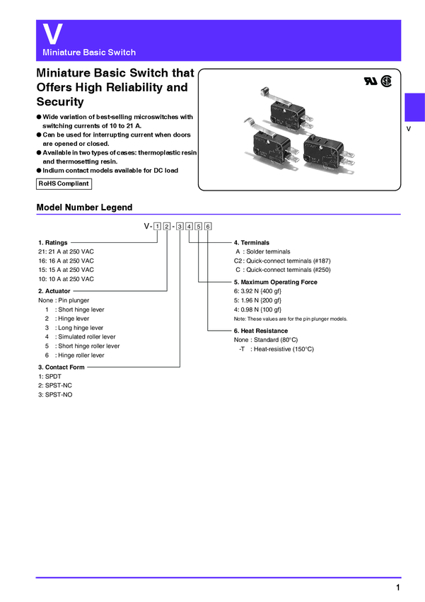 Switch Snap Action N.O./N.C. SPDT Long Hinge Lever Quick Connect 15A 250VAC 250VDC 0.69N Screw Mount