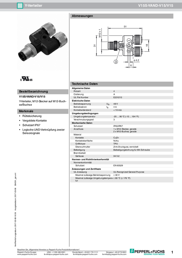 Rozdzielacz Y Pepperl+Fuchs V15S-YAND-V15/V15 304591, 1 szt.