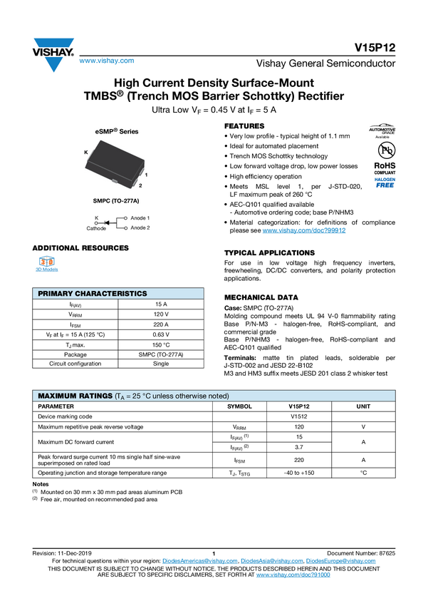 High Current Density Surface-Mount TMBS® (Trench MOS Barrier Schottky) Rectifier Ultra Low VF = 0.32 V at IF = 5 A