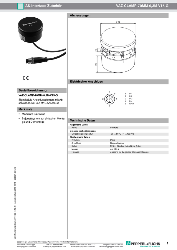 Element przyłączeniowy Pepperl+Fuchs VAZ-CLAMP-70MM-0,3M-V15-G 285087 1 szt.