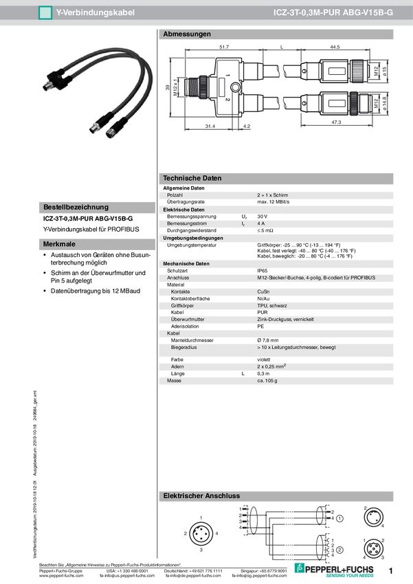 Pepperl+Fuchs 249684 Kabel połączeniowy ICZ-3T-0,3M-PUR ABG-V15B-G 1 szt.