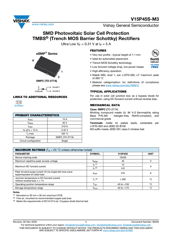 SMD Photovoltaic Solar Cell Protection TMBS® (Trench MOS Barrier Schottky) RectifiersUltra Low VF = 0.31 V at IF = 5 A