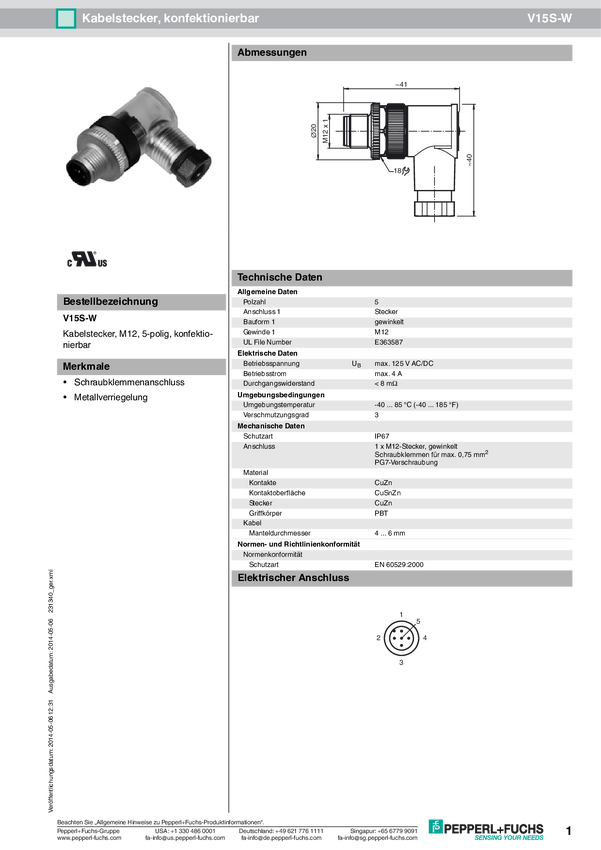 Pepperl+Fuchs 229220 Złącze niekonfekcjonowane czujnika/aktuatora V15S-G, piny: 5, 1 szt.