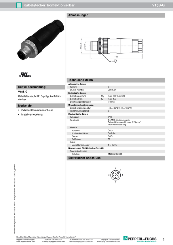 Pepperl+Fuchs 115060 Złącze niekonfekcjonowane czujnika/aktuatora V15S-G-PG9, piny: 5, 1 szt.