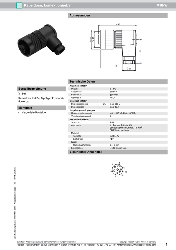 Pepperl+Fuchs 105011 Gniazdo kablowe V16-W, piny: 6, 1 szt.