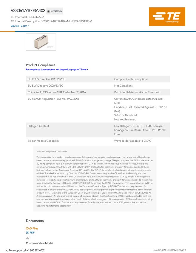 TE Connectivity V23061A1003A402 tuba 1 szt.