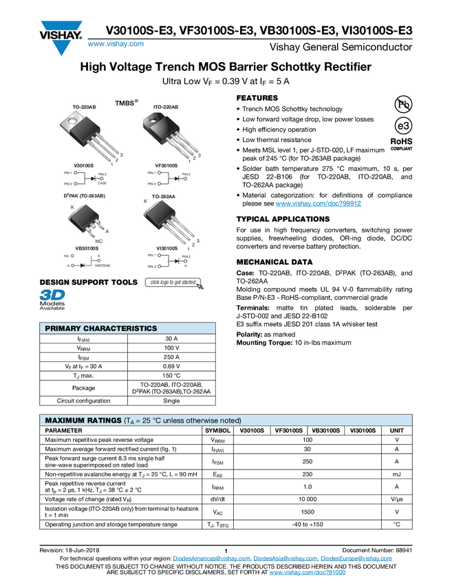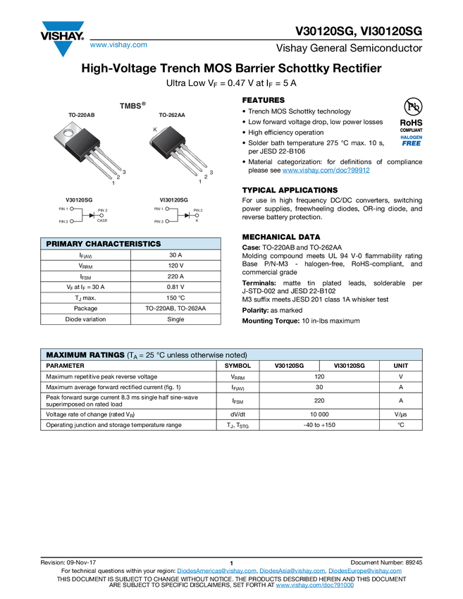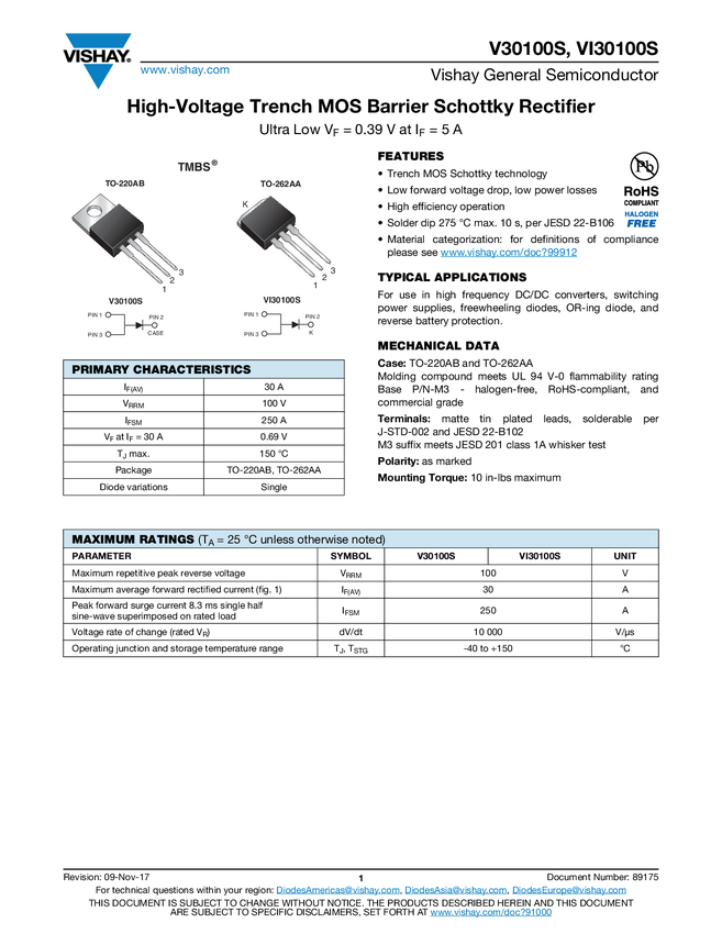 Dual High Voltage TMBS® (Trench MOS Barrier Schottky) Rectifier Ultra Low VF = 0.50 V at IF = 5 A