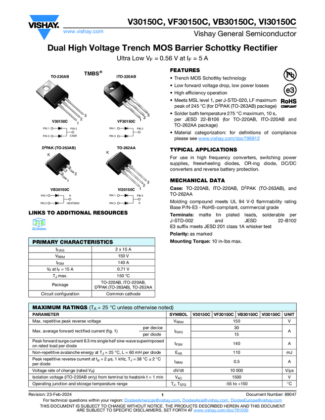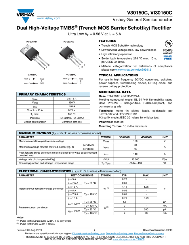Dual High-Voltage TMBS® (Trench MOS Barrier Schottky) Rectifier Ultra Low VF = 0.56 V at IF = 5 A