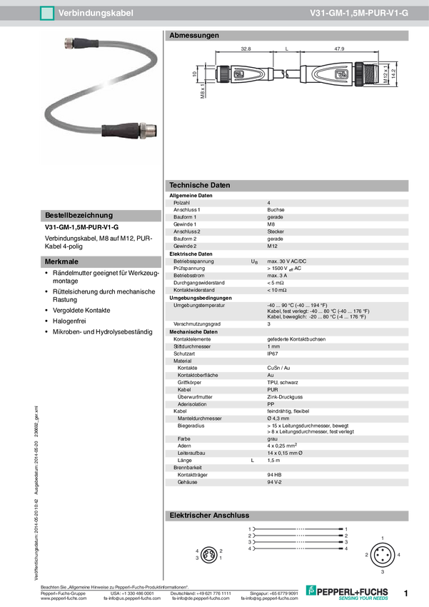 Pepperl+Fuchs 236692 Złącze czujnika/aktuatora V31-GM-1,5M-PUR-V1-G, piny: 4, 1.50 m, 1 szt.