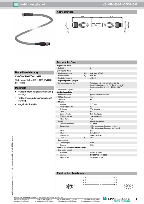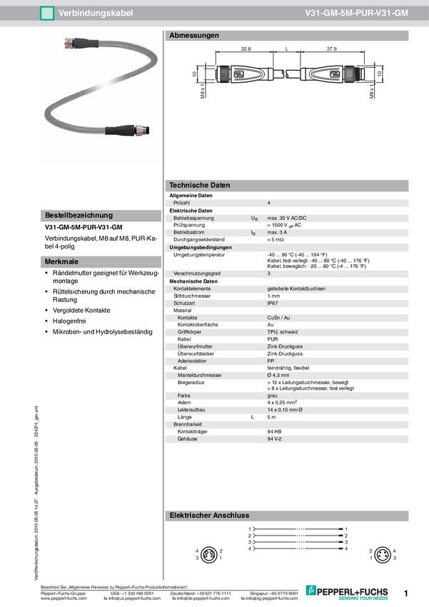 Pepperl+Fuchs 226033 Gniazdo kablowe V31-WM-BK5M-PVC-U, piny: 4, 5.00 m, 1 szt.