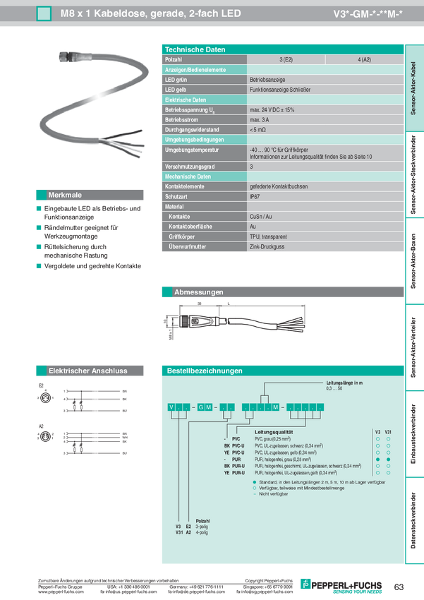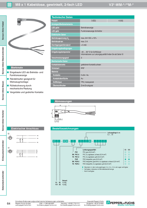Pepperl+Fuchs 224373 Złącze czujnika/aktuatora V31-GM-3M-PUR-V31-GM, piny: 4, 3.00 m, 1 szt.