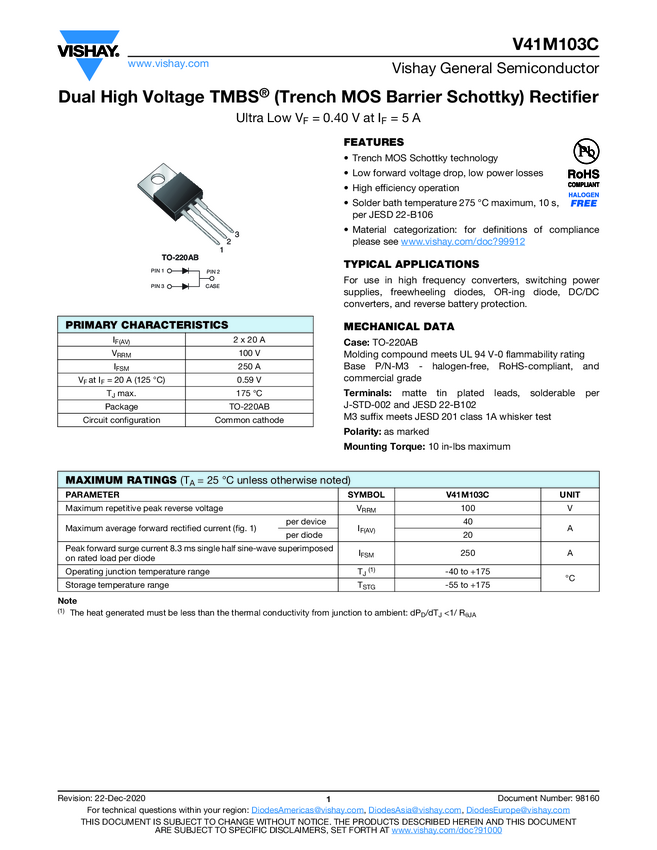 Dual High Voltage TMBS® (Trench MOS Barrier Schottky) Rectifier Ultra Low VF = 0.40 V at IF = 5 A