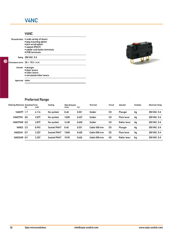 Mikroprzełącznik; V4NCT7-AR1; z dźwignią (z rolką); SPDT; 5A/250V; ON-(ON); SAIA-BURGESS; RoHS